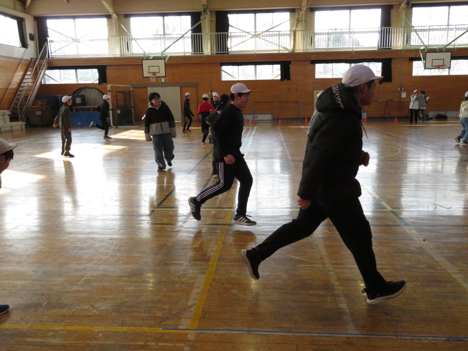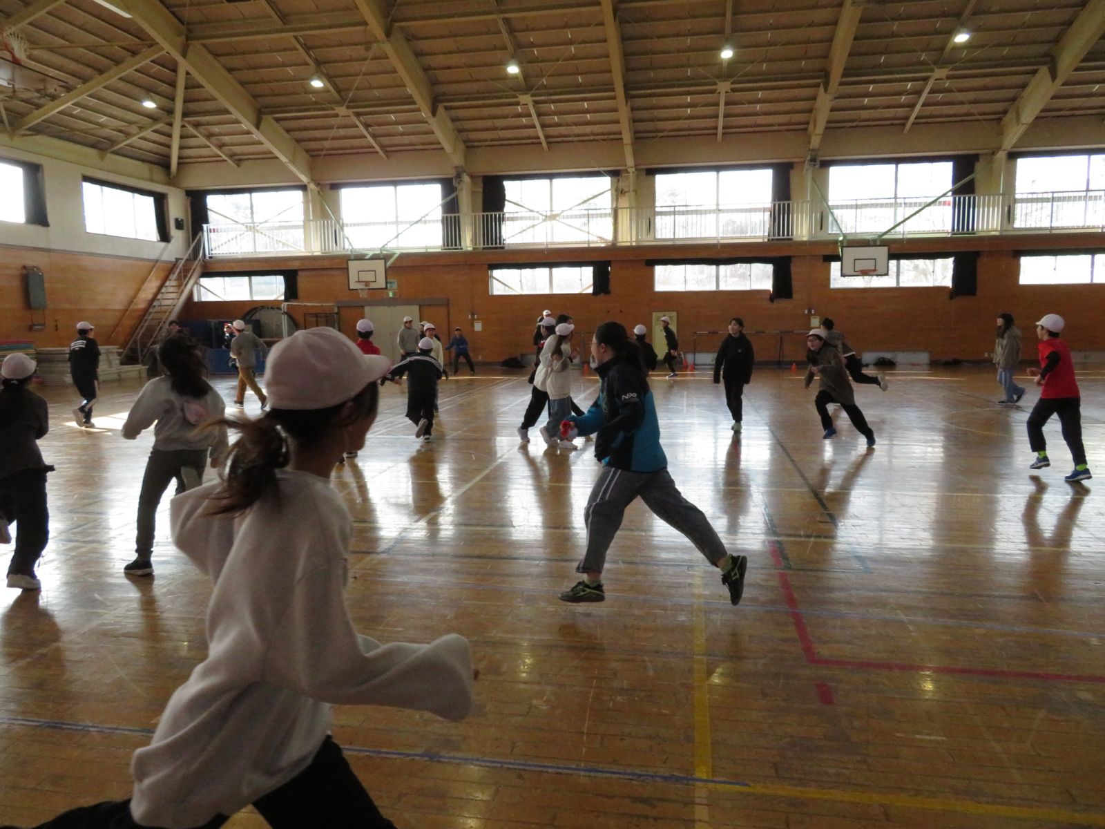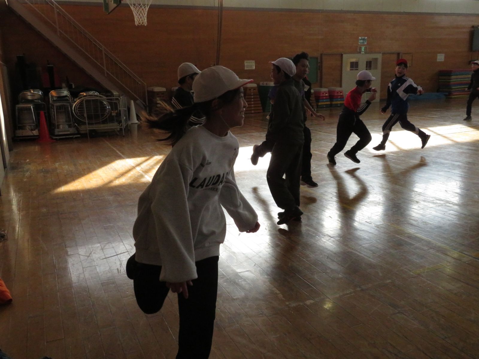 をして体をあたためています。タッチすると鬼が交代するようです。今日は体育館の中がかなり冷え込んでいますが,元気いっぱいに走り回っていました。