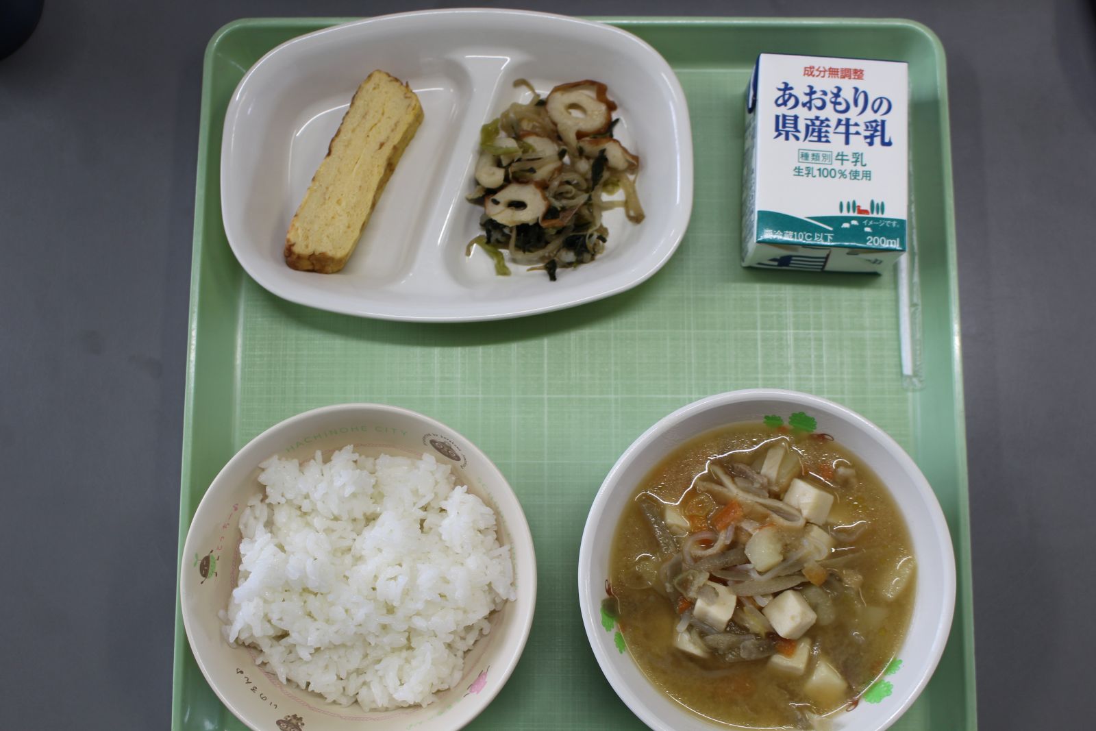本日の献立は、ごはん、牛乳、とん汁、県産厚焼き玉子、小松菜とちくわの炒め物 です。