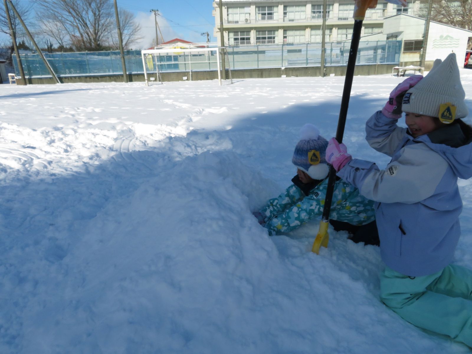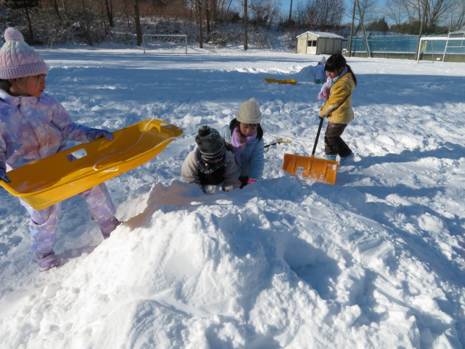 2時間目の1年生の様子です。おともだちと力を合わせてかまくらやすべり台,小さなお山などをつくりました。校庭が見事な