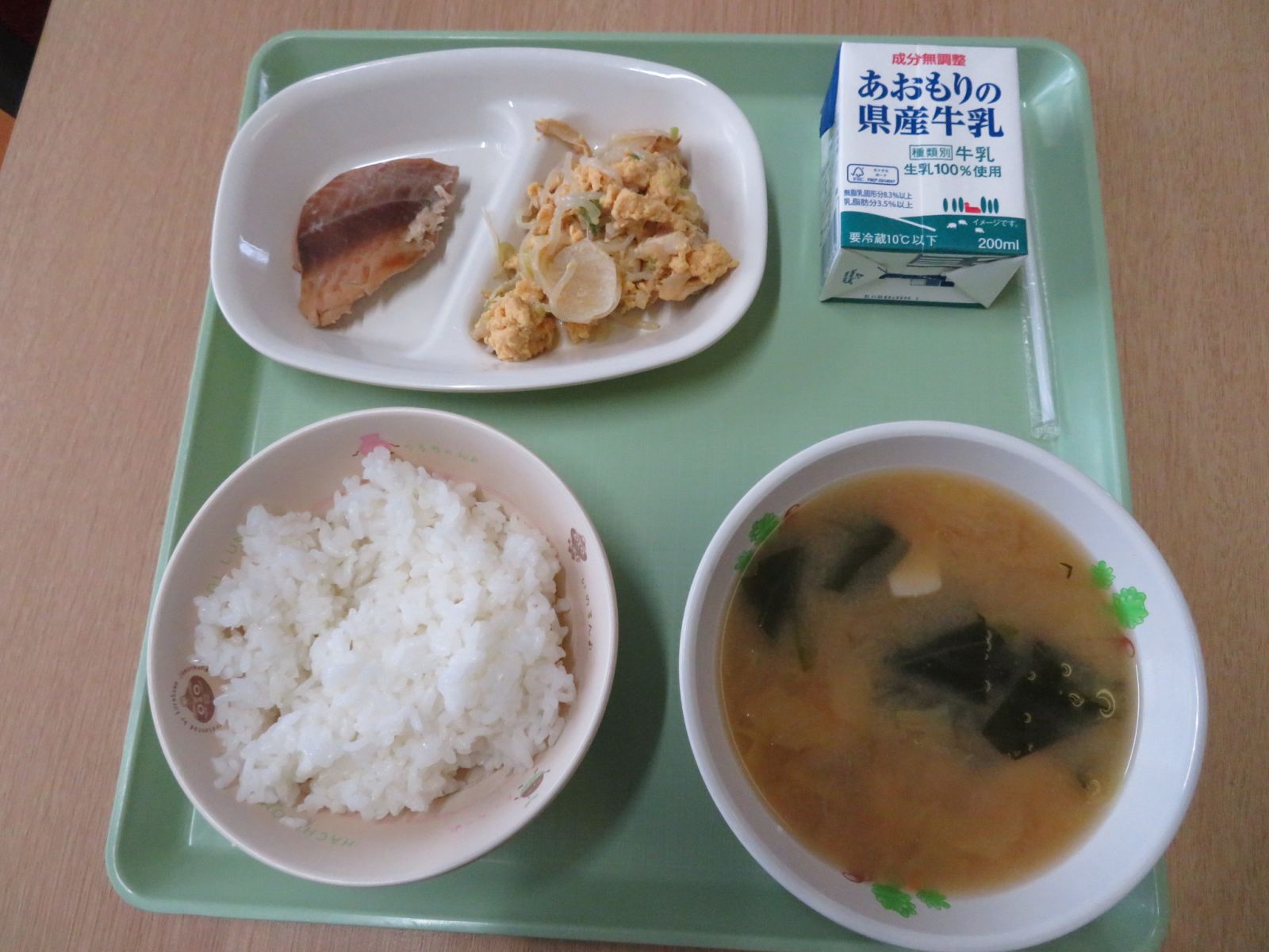 ご飯,牛乳,小松菜と白菜の味噌汁,味噌貝焼き風たまごとじ,サメの煮つけ