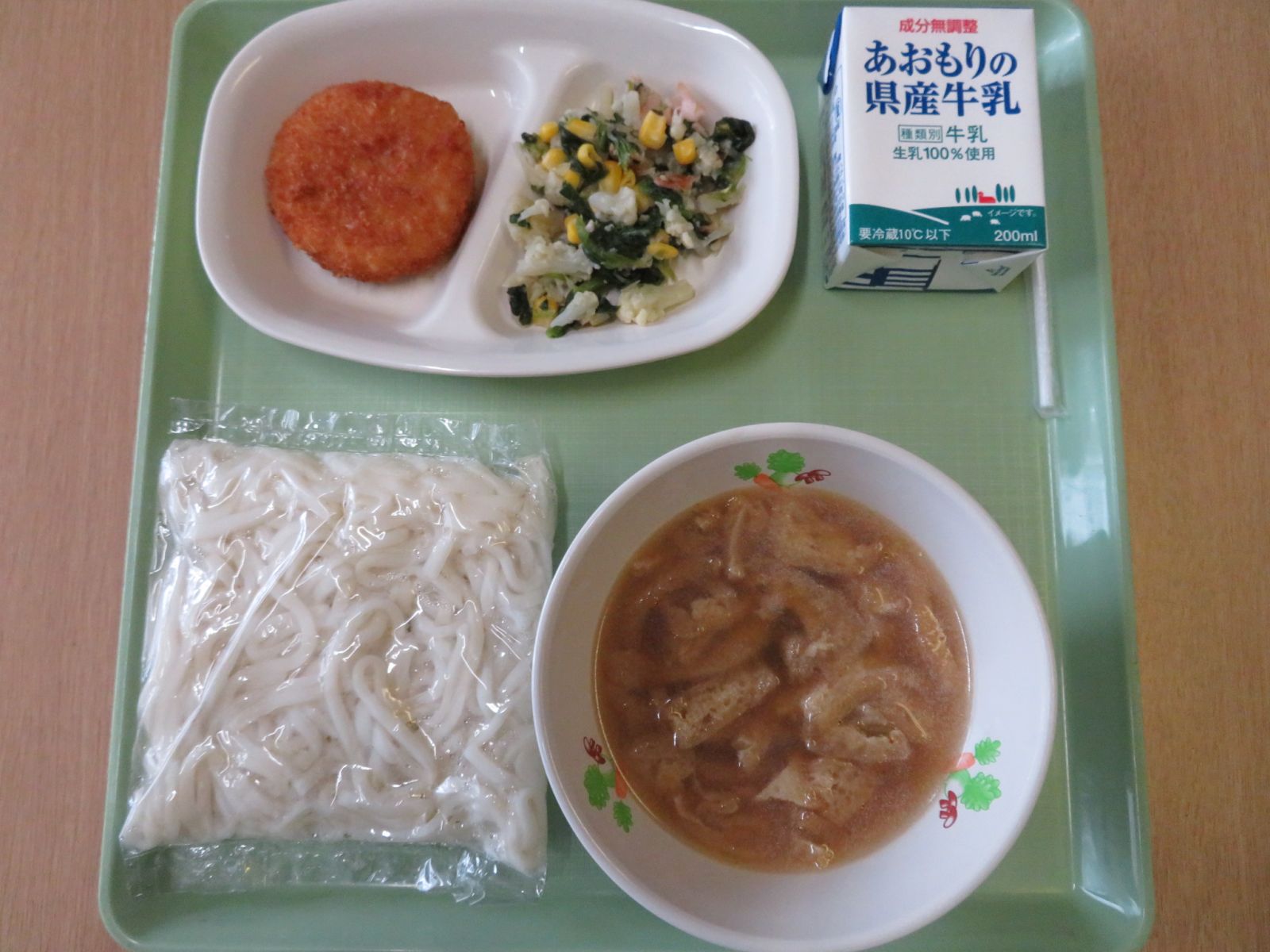 きつねうどん,牛乳,コロッケ,ほうれん草とハムのソテー