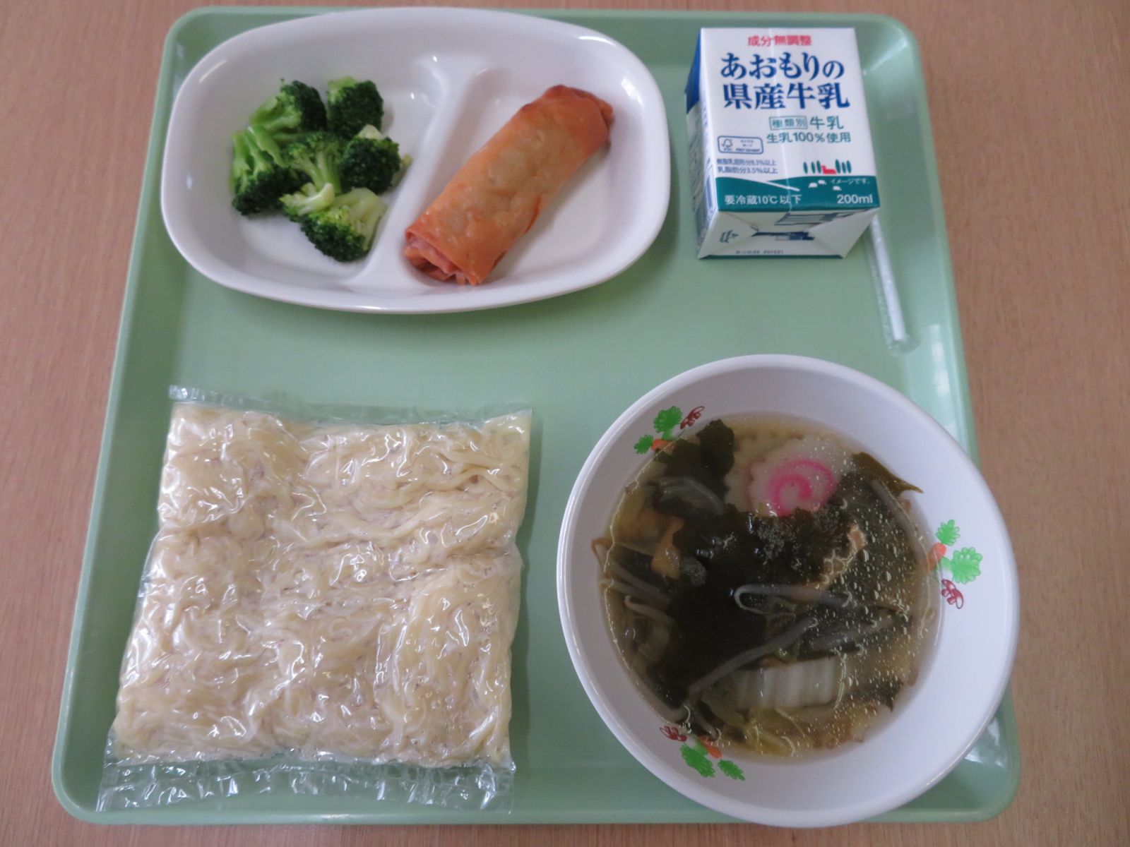 今日の給食は,海藻ラーメン,牛乳,春巻き,ブロッコリーの塩ゆででした。