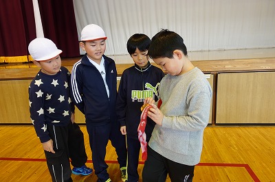 体験活動を終えた後、明治の子たちにメダルを触らせてくれました。