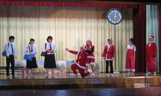 圧巻だったのは、本校の恒例となっている全校演劇です。今年は「真夏のサンタクロース」という作品に挑戦し、「愛する家族への想い」「幸せとは一体何なのか」という深いテーマのもと、生徒たちは自分の役を見事に演じ切りました。練習では苦難の連続でしたが、生徒たちは決してあきらめることなく、本番でも実力を大いに発揮しました。