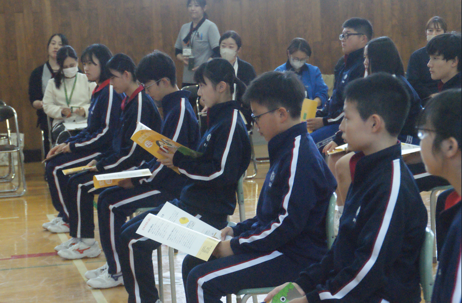 認知症の対する理解を深め、困っている高齢の方への接し方を学ぶことを目的として認知症サポーター養成講座を行いました。講座では認知症についての講義や寸劇、模擬訓練など多岐にわたる内容で、生徒たちは楽しみながら認知症への理解を深めていました。模擬訓練では困っている高齢者に扮した方々へ実際に声がけをする場面もあり、生徒たちは緊張しながらも優しく接していました。