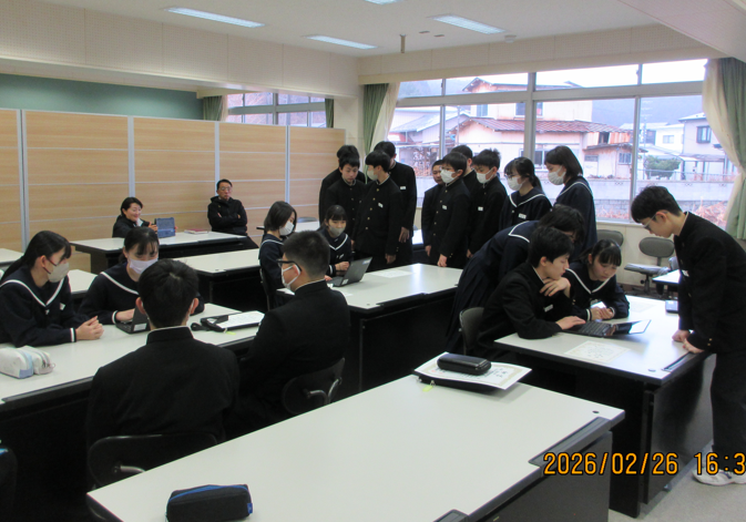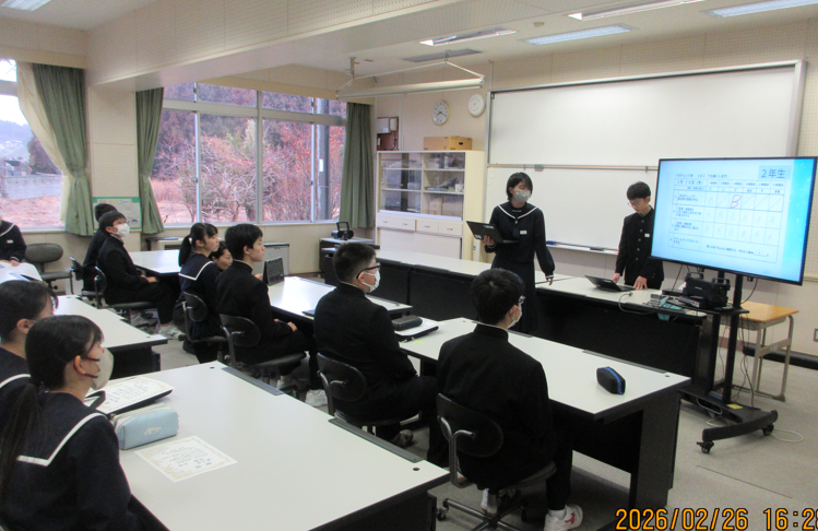 2月27日(金)の生徒朝会では「お互いのよかったところ」「1年間を振り返って、学級のよかったところ」「今年度を終えるまで、力を入れて取り組みたいこと」について話合いが行われました。