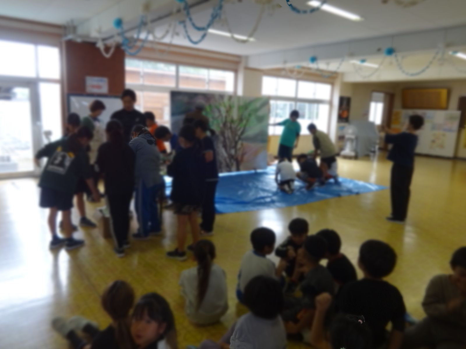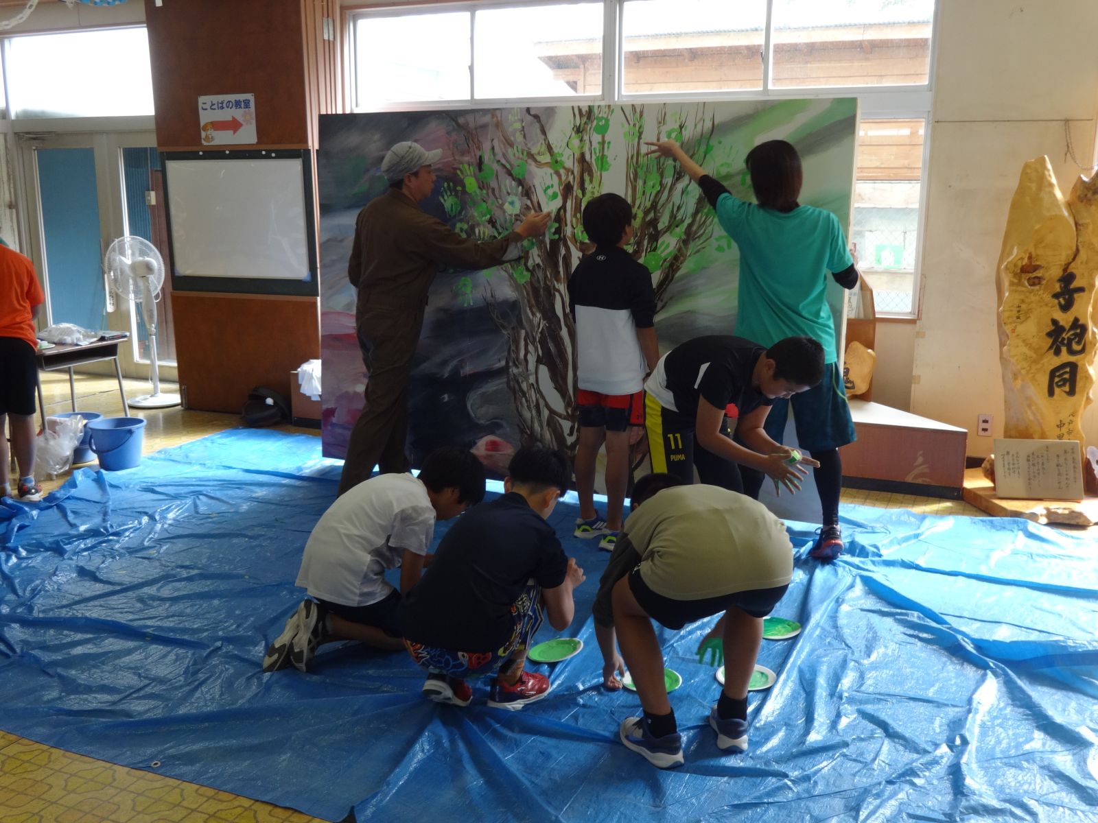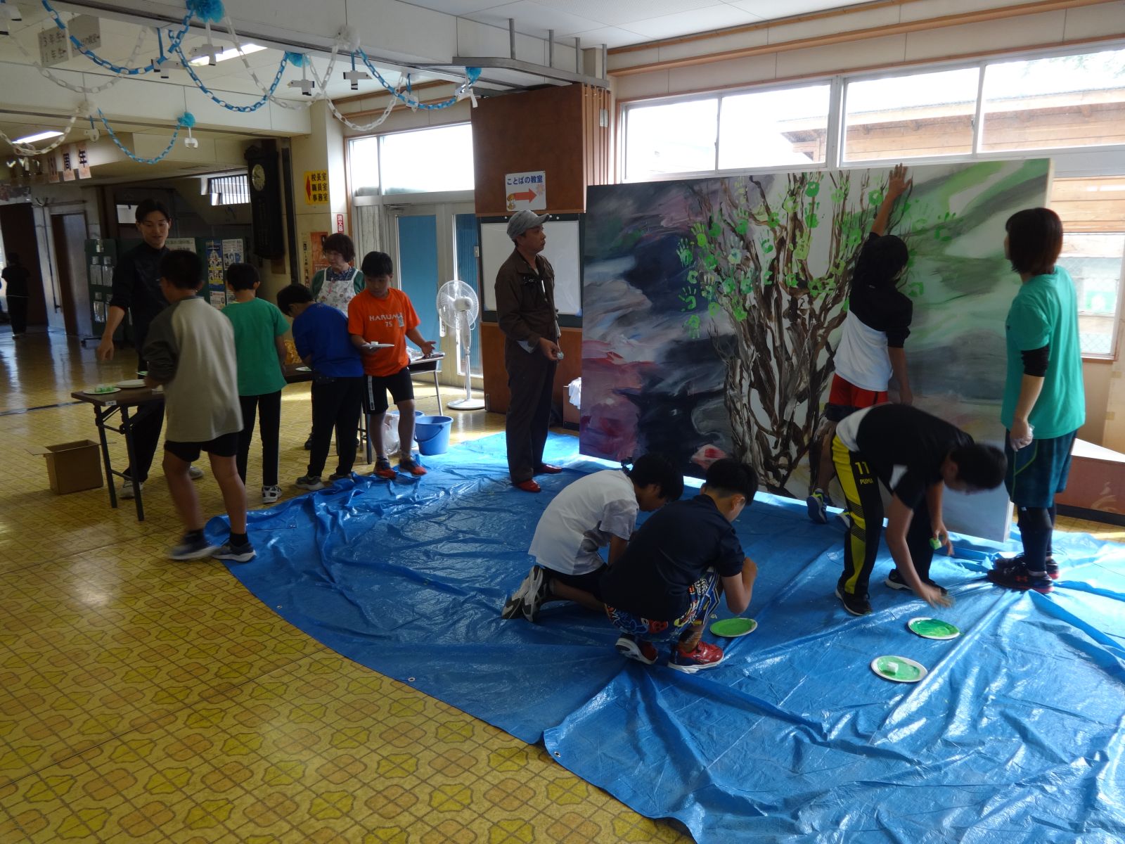 10日の2校時からの時間で、「ポプラの手のひらアート」に全校で取り組みました。これは地域出身の画家、三戸晴輝さんの描いたポプラの幹に、こどもたちが手のひらに緑の絵の具をつけて、葉をイメージしながらスタンプのように押し付けて手形を付ける活動です。三戸さんが描いたもとの絵画も素晴らしいのですが、それに緑や黄色など、様々な色の手形がついて、より、本物のポプラのような絵画になりました。全校のみんなで仕上げる作品なので、欠席したりしてできなかった人は、月曜日以降に「ペタッ」としてもらいます。こどもたちにとっては、とってもいい記念になりました。全員ですんだら、後日、150周年記念の名札を付けてもらうことになっています。こちらもまた、地域の三浦ひろみさんに書いてもらうことになっていました。今から完成が楽しみです。