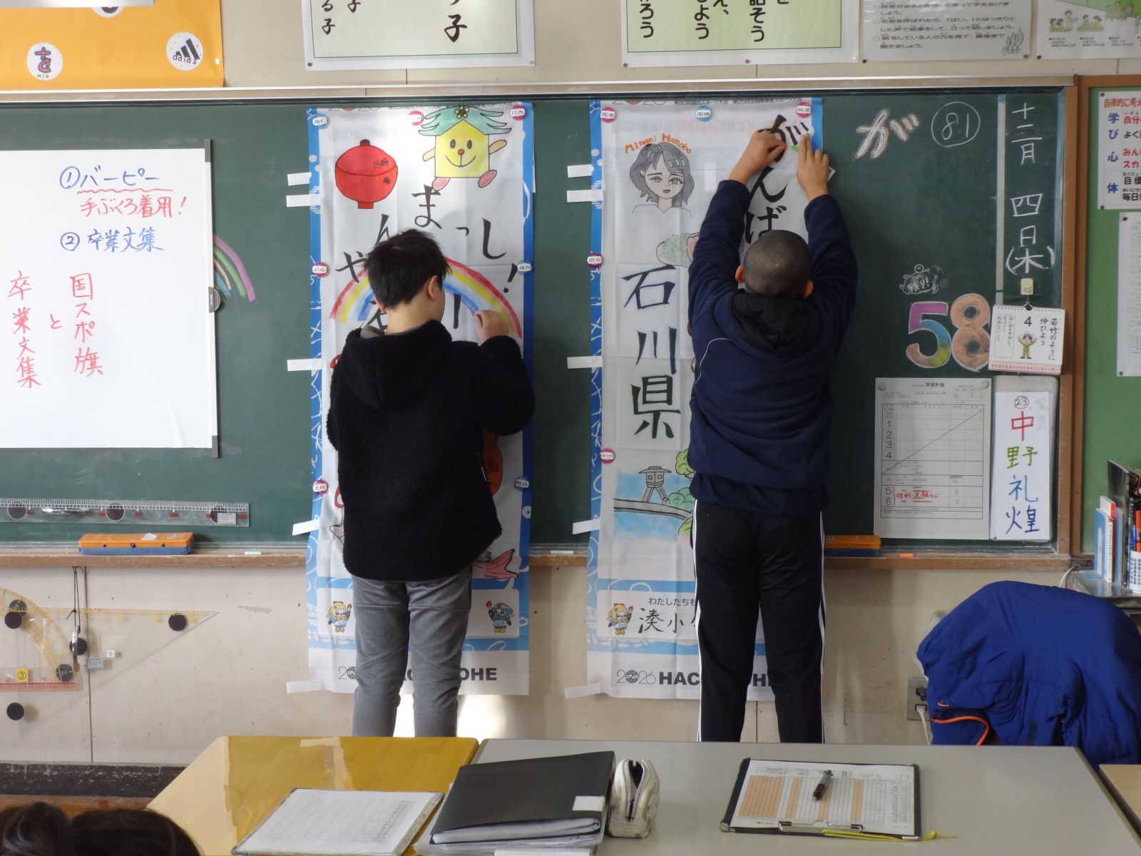 この冬1月31日から2月17日まで開催される「青の煌きあおもり国スポ・障スポ2026冬季大会」の応援のぼりを6年生が作成中です。これは、市内全小学校に都道府県が割り振られ、各地域の名産や特産物、方言などを調べて図案を考え、自分たちで手作りする応援のぼりです。