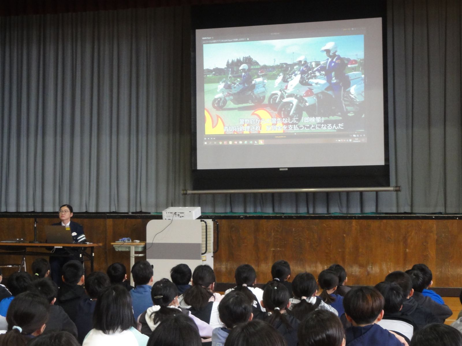 3校時は、八戸警察署の宮下さんに来ていただき、青森県警で制作した動画をもとに、自転車の安全な乗り方や、やってはいけない危険な乗り方、さらに、この4月1日から法改正になった点について、詳しく教えてもらいました。青切符が切られ、罰金がとられるのは16歳以上からですが、今のうちから覚えておくことが大切です。ご家庭でも、道路の標識など、ときどき教えてもらえればと思います。
