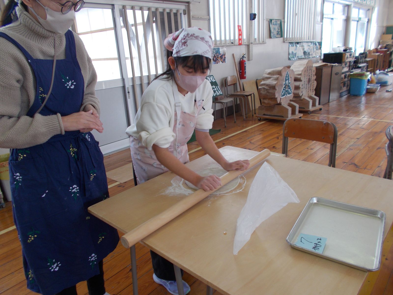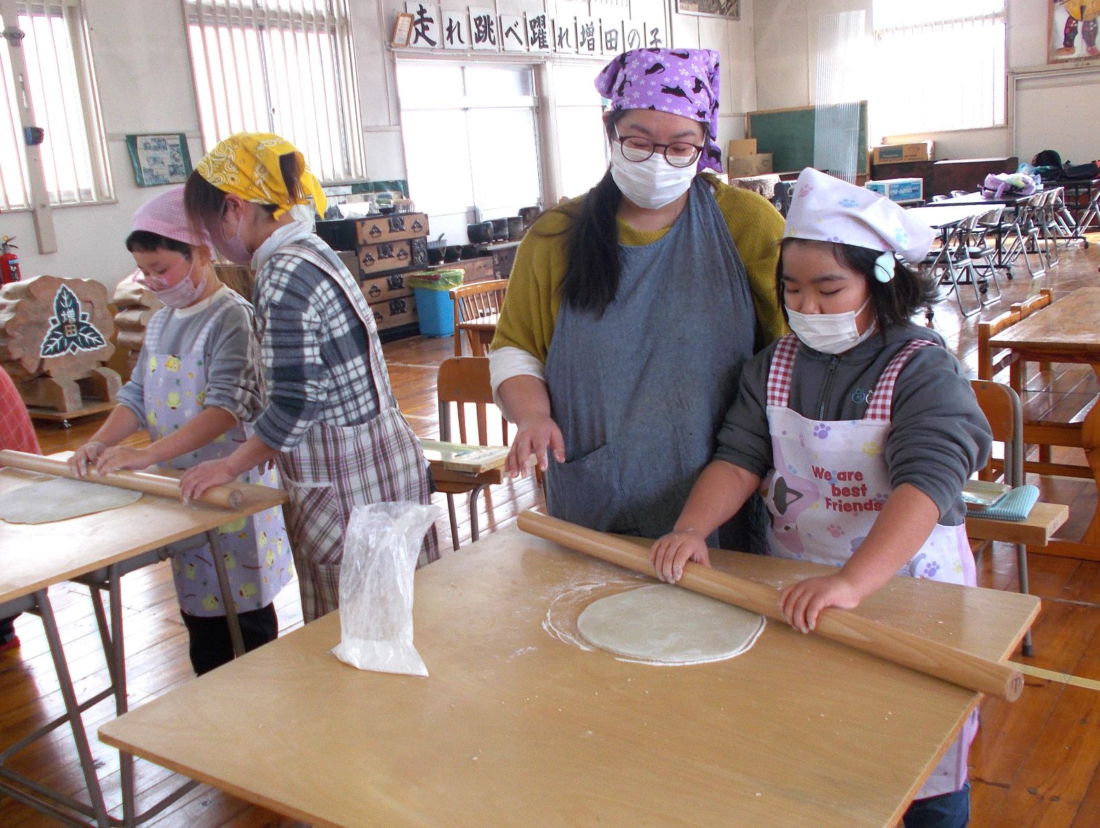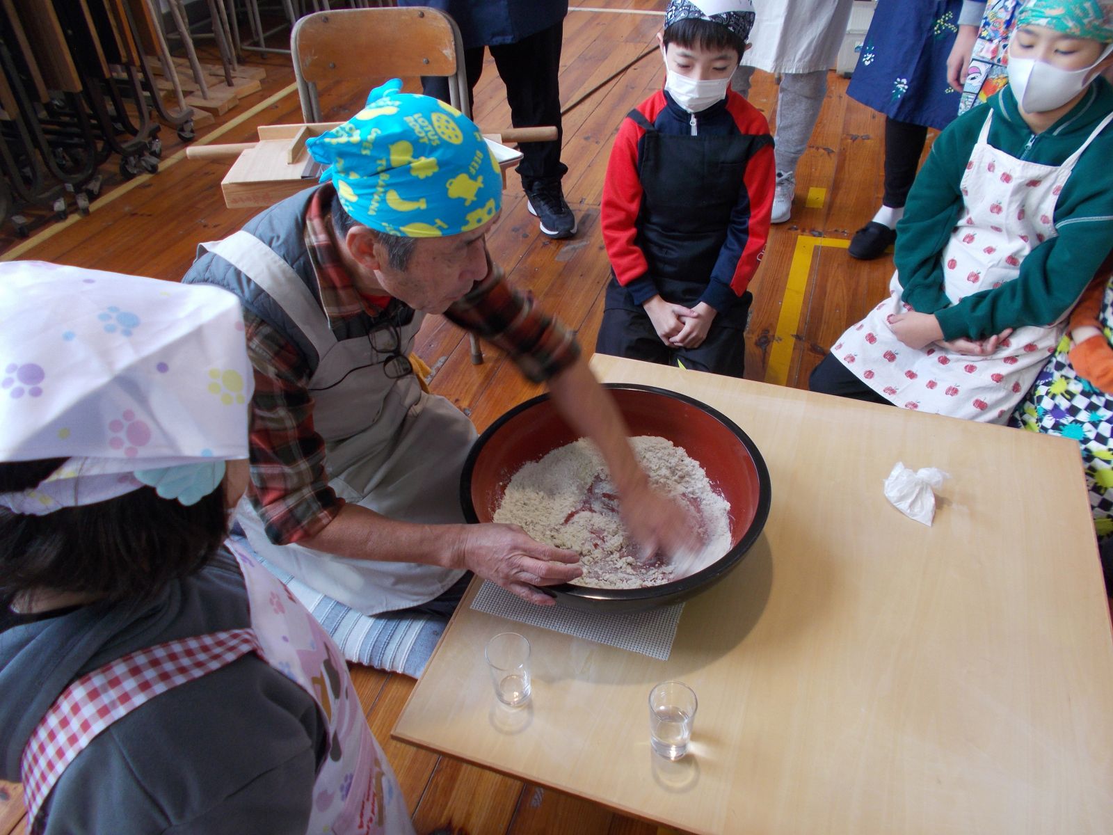 12月4日(木)、4年生がふるさと学習のそば作りで、「そば打ち」を体験しました。石臼を引いてそば粉にしたり、そば打ちをしたりして、自分のそばを作りました。そして、完成したそばをおいしくいただきました。とても楽しい時間でした。