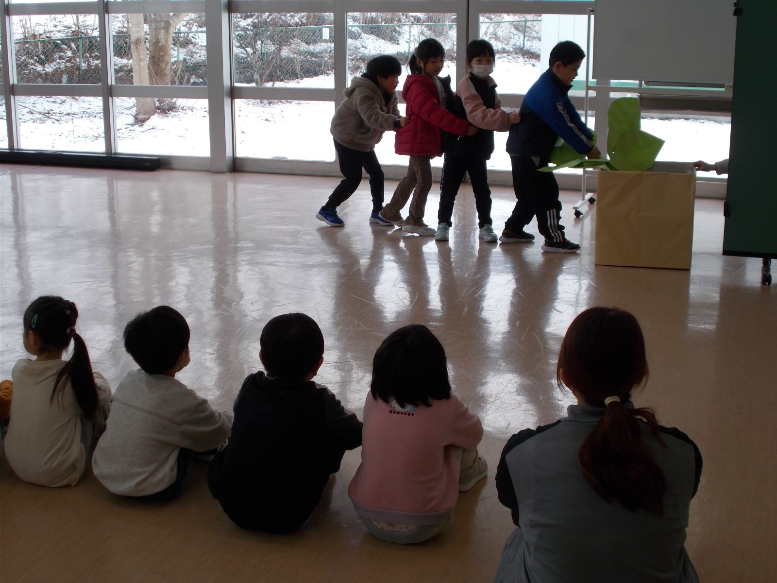 3月4日(水)、保育園の年長さんを招いて、1年生が交流しました。国語で学習したお話を聞かせたり、体育館で一緒に鬼ごっこをしたり、楽しい時間を過ごすことができました。