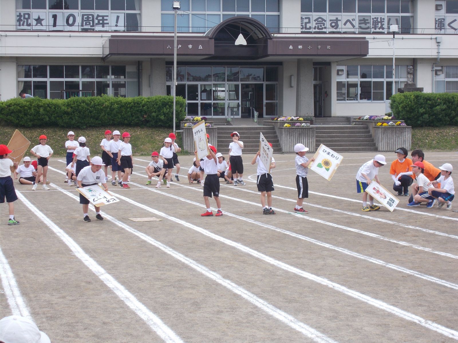 5月17日(土)、本校校庭にて、創立10周年大運動会が盛大に開催されました。10周年のお祝いをこめて、工夫された競技や演技、特別種目が行われました。まずまずの天候で、全校児童全員が最後まで全力でがんばることができました。朝早くから、水まきや会場準備、競技の準備、応援や後始末と地域や保護者の皆様のお力を借りることができ、たいへん助かりました。