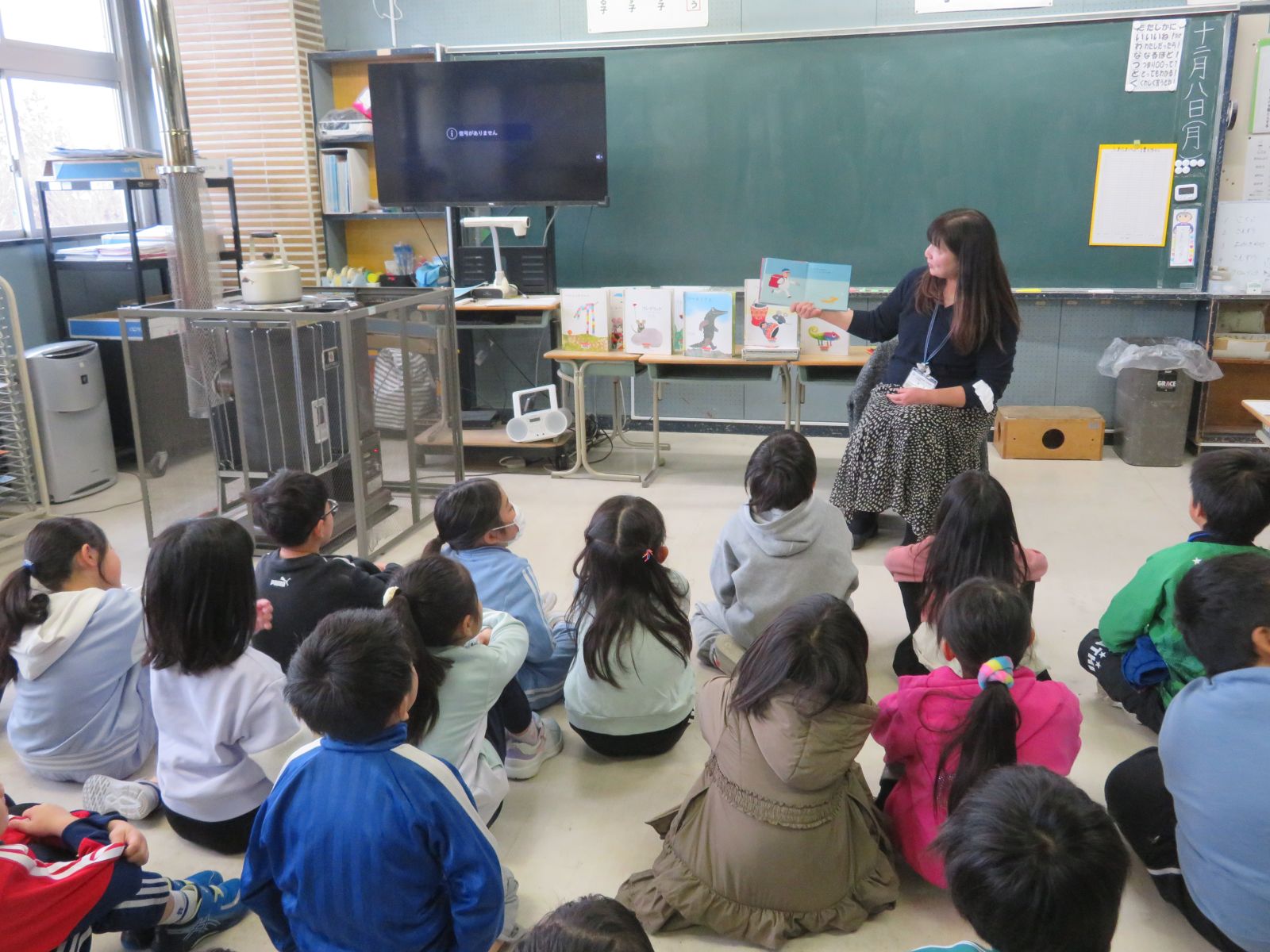 12月3日(水)、読書月間は終わりましたが、学校司書の源新さんが1年生を対象に本の読み聞かせをしてくださいました。