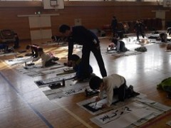 1月16日の4・5年生の書き初めに続き、3年生も体育館で書き初めに挑戦しました。校長先生から条幅の紙の使い方や筆運びの指導を受けながら、集中して作品を仕上げていました。
