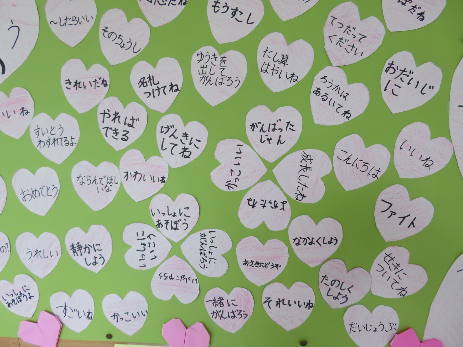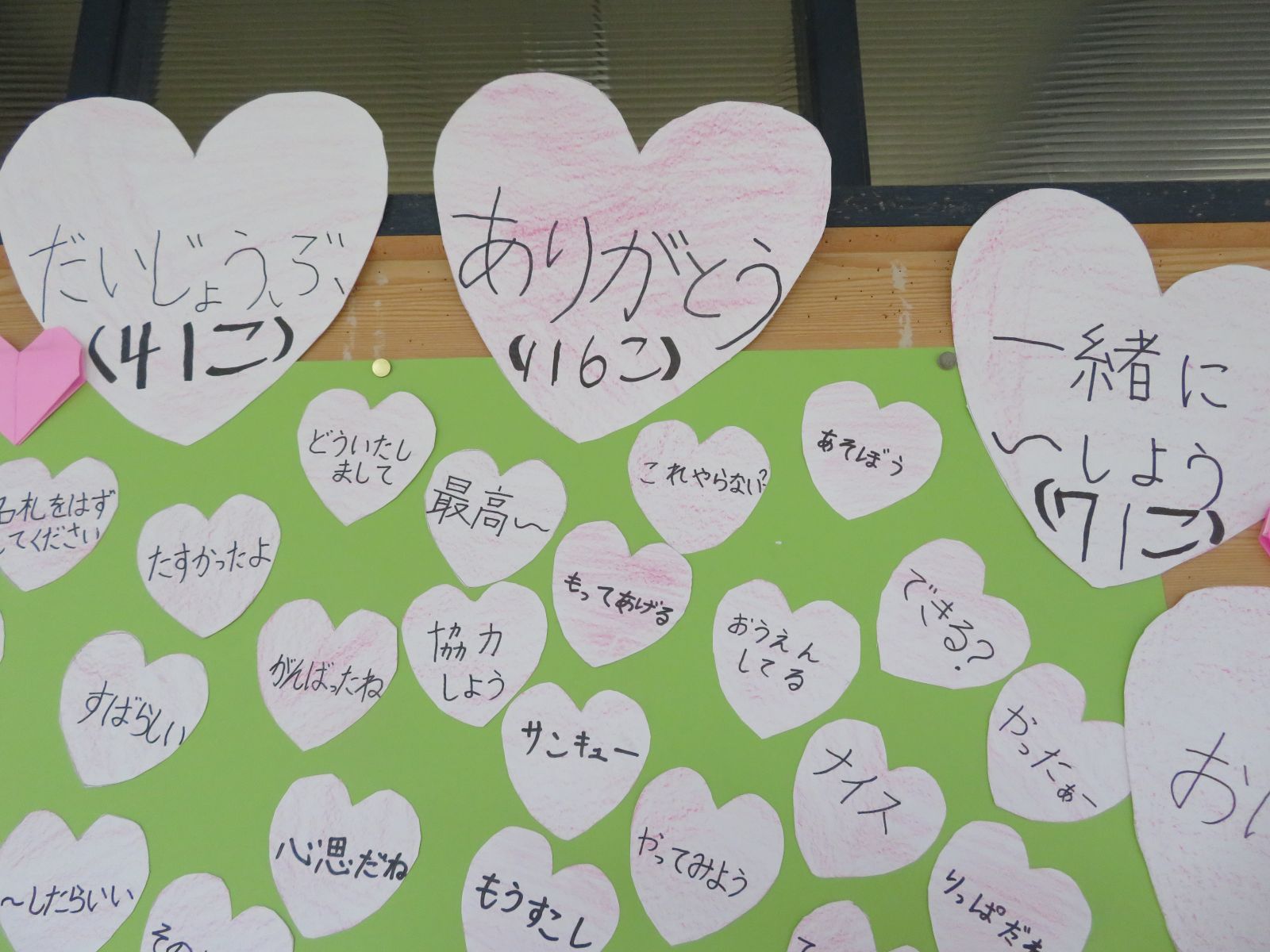 9月末、計画委員会でやさしいことば集めを実施しました。その際集まった「ふわふわハッピー言葉(やさしいことば)」を、保健室前廊下に掲示しています。全校で「言葉づかいに気を付ける」というめあてを立て、計画委員会が各学級からやさしいことばを集めてくれました。541個の言葉が集まり、一つ一つの言葉にホッとします。
