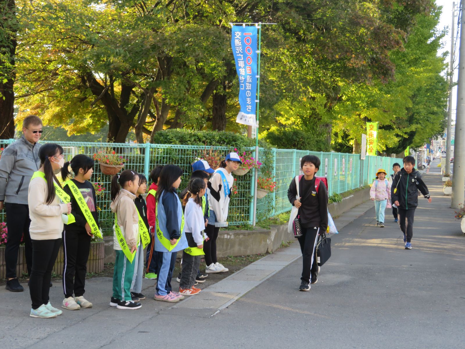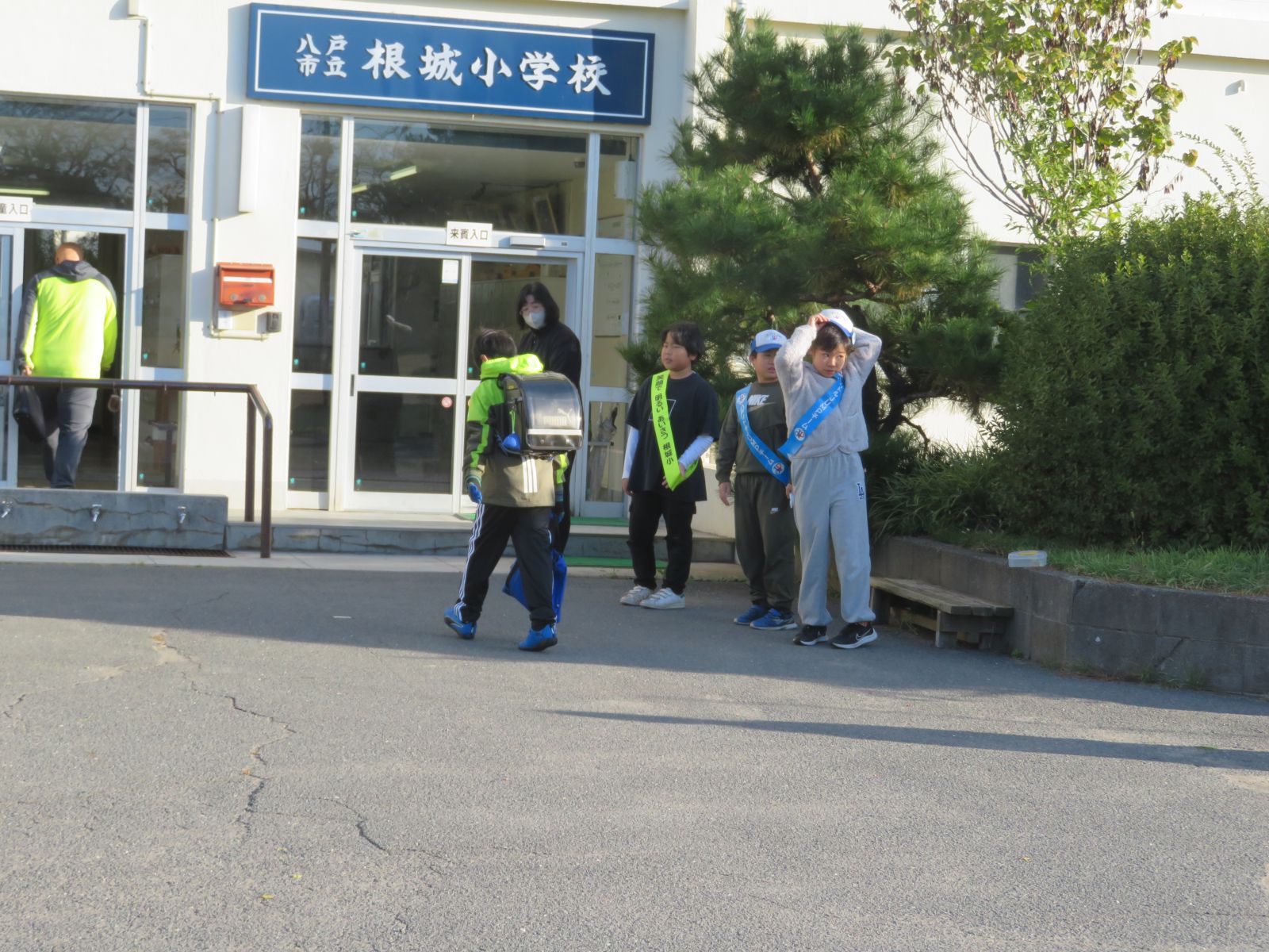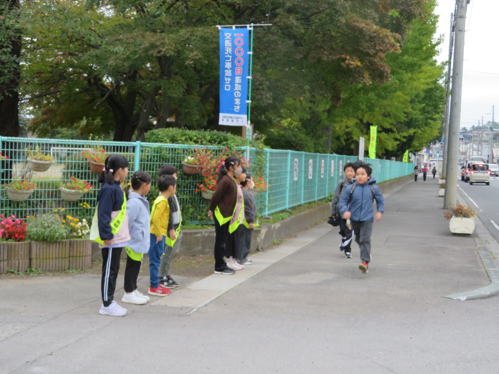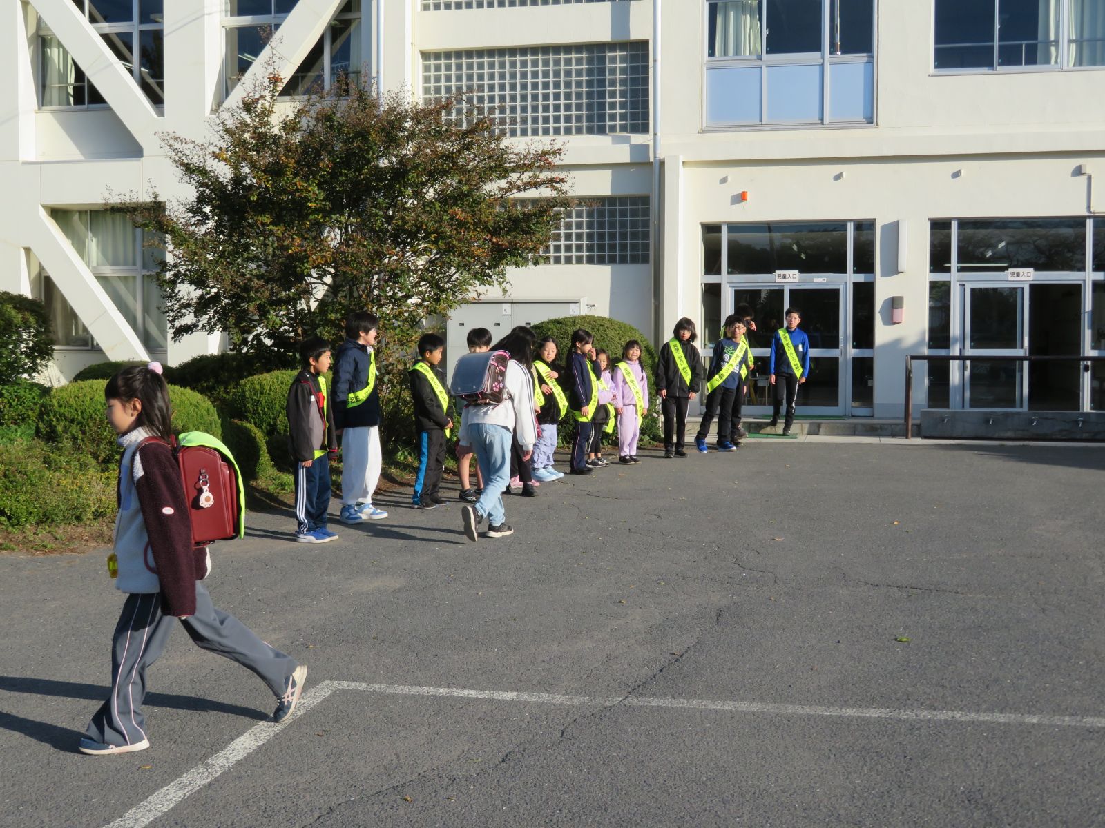 だいぶ寒い朝となり、登校する子どもたちの中には、厚手の上着、マフラー、手袋などを身に付けて寒さ対策をしている様子がたくさん見られました。