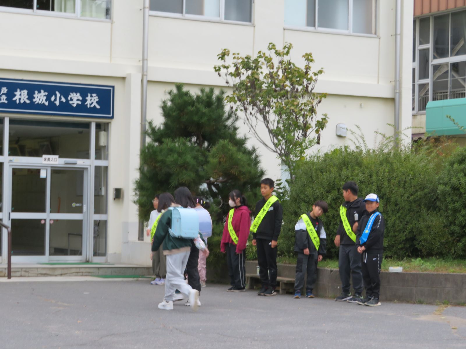 10月21日(火)、5回目となる縦割りグループによるあいさつ運動が行われました。今回は、5班と14班です。だいぶ気温が下がって、寒い朝でしたが、白い息を吐きながら元気で明るいあいさつを心がけました。