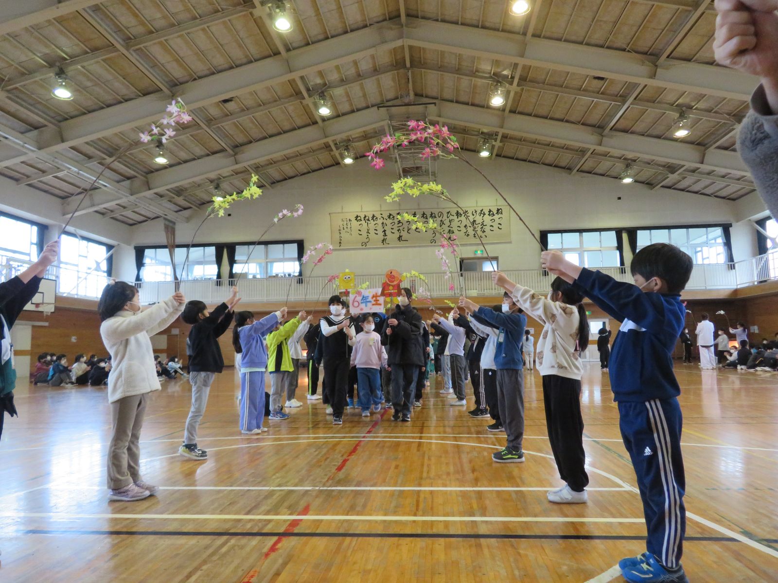 1年生は6年生と手をつないで入場、2年生は入場のアーチと招待状担当、3年生はメダルのプレゼント、4・5年生は、みんなで楽しめるレクリエーション、そして、6年生からは感謝の出し物です。