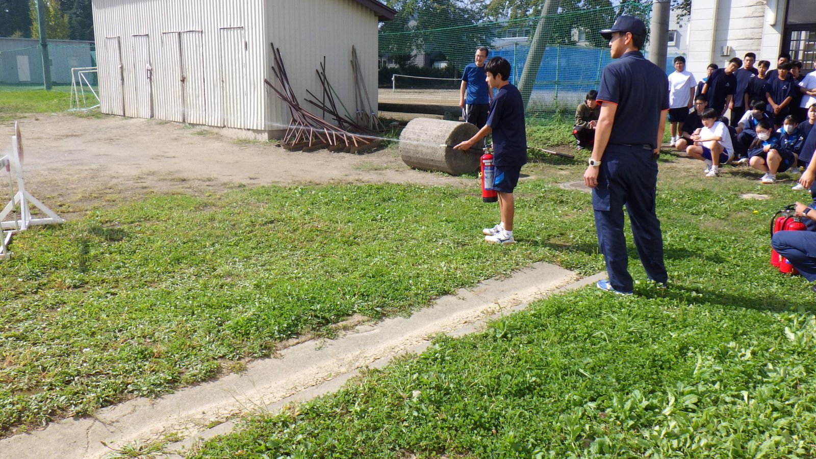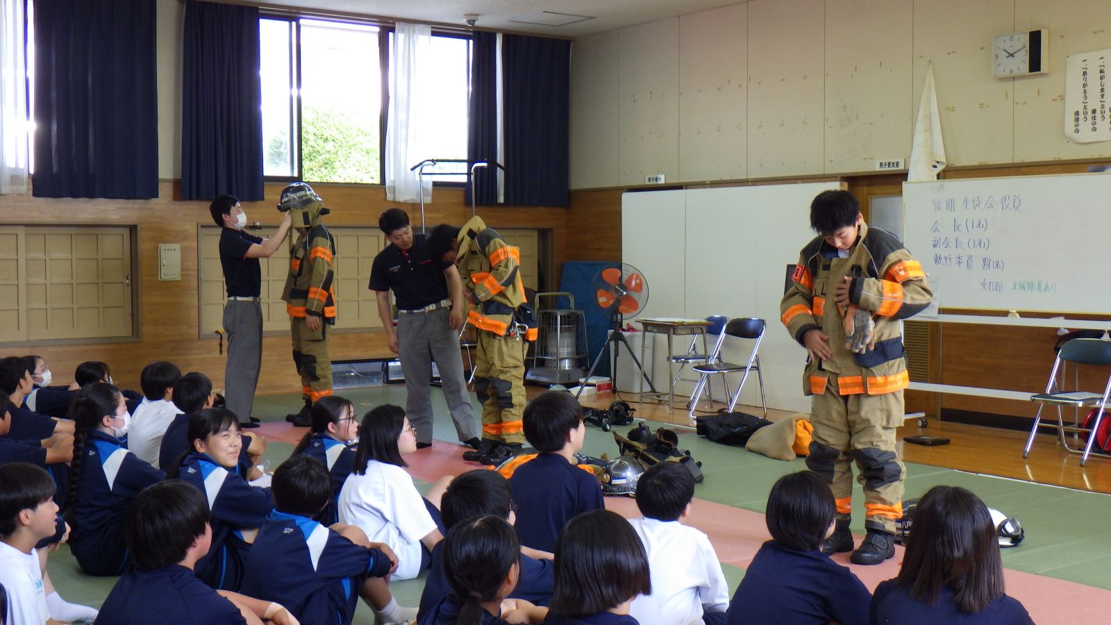 また、1、2年生は、根城分遣署の職員の方々に教えていただきながら、水消火器体験や消防服の着衣、救助袋体験、濃煙体験を行いました。