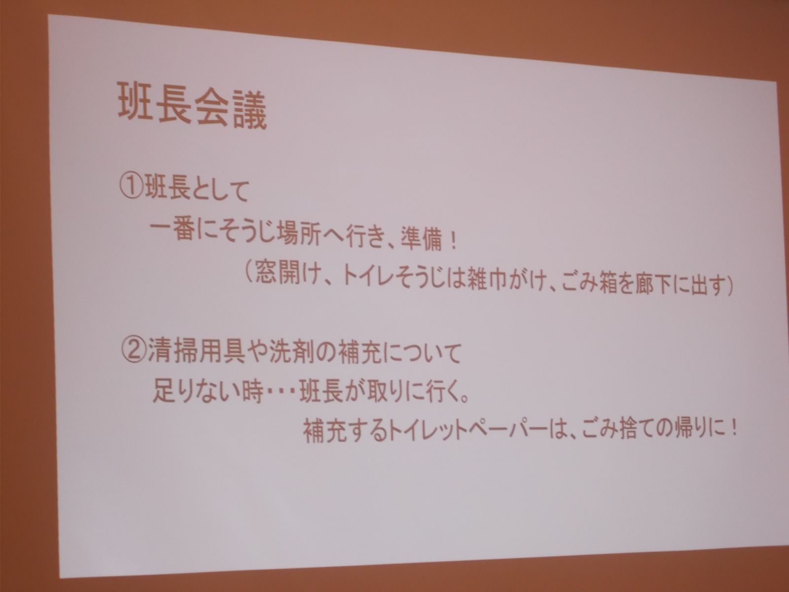 後期の清掃に向けて、掃除の変更点や反省の仕方について学びました。