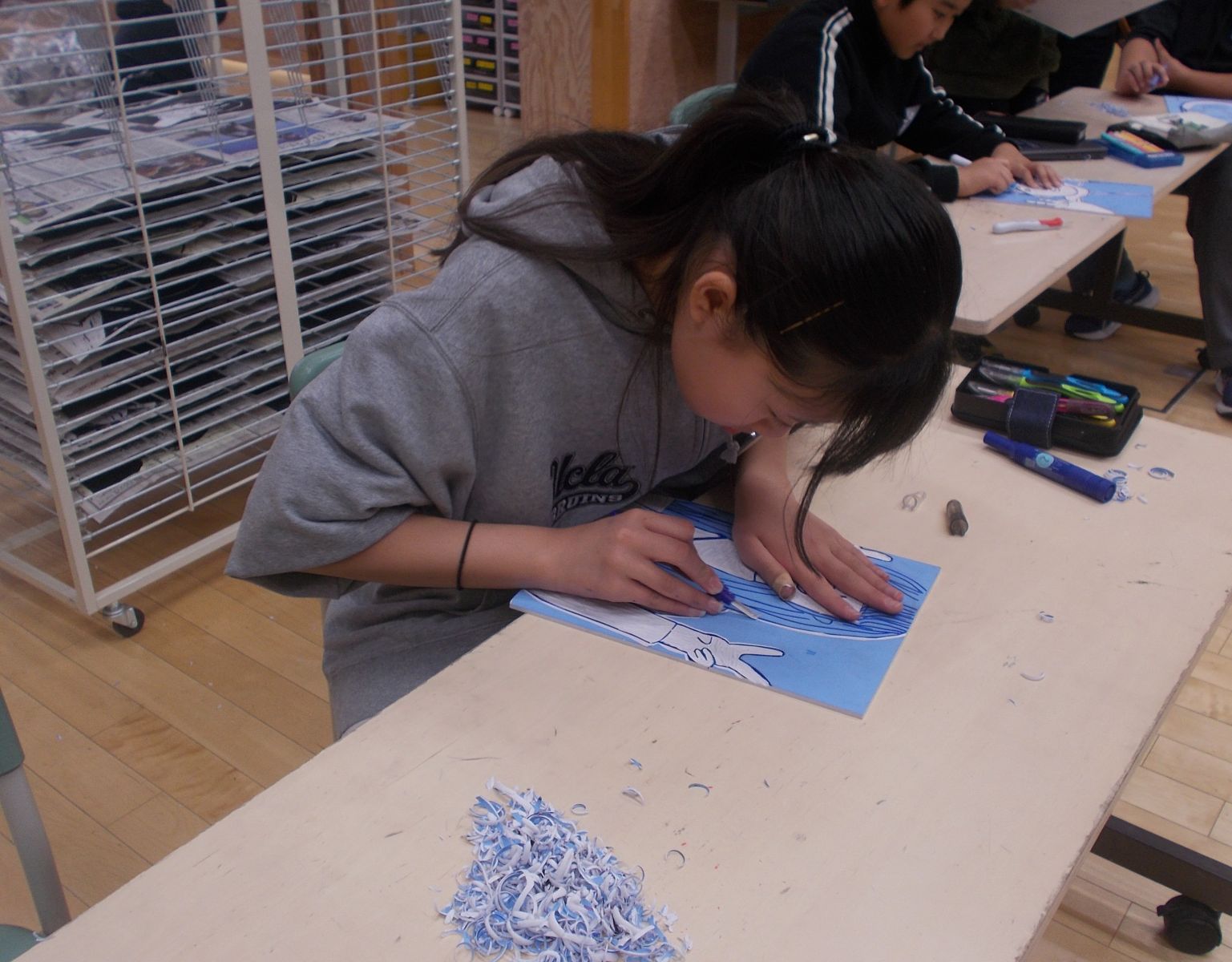 図工の時間に時間に、小学校生活最後となる版画の制作に取り組みました。