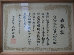 このほど、本校ならではの行事である海岸清掃が、50年の長きにわたる海岸環境美化活動としての功績が認められ、県知事表彰を受賞しました。大久喜の海の環境を守りながら、故郷への誇りを忘れないためにも60年、70年と継続していきたい行事の1つです。なお、19日に今年度2回目の海岸清掃が予定されています。