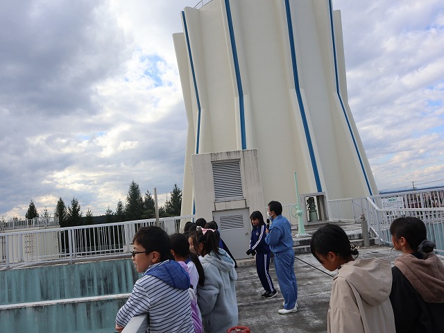 高い配水塔の前で、水がきれいになる様子を実際に見ることができました。