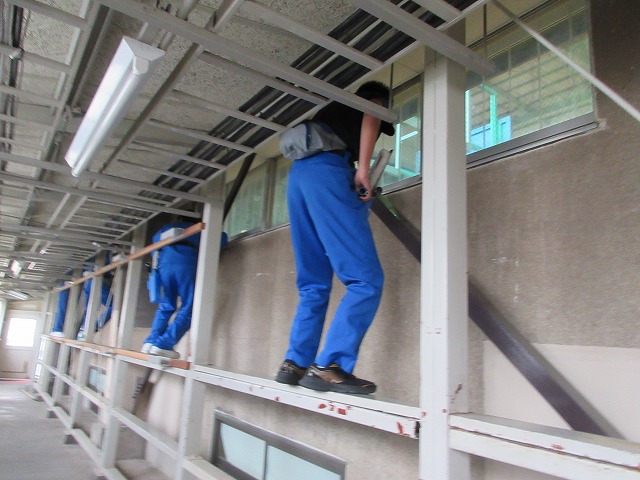体育館の窓は、卒業記念の絵を取り外し、梁に上ってきれいに磨いてくださいました。