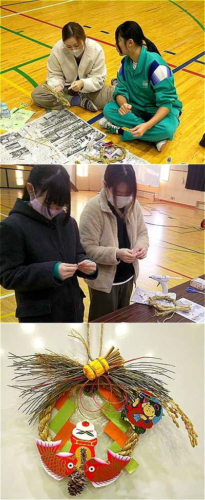 自然の家から指導員さんを招いて1,2学年「親子でしめ縄づくり」。