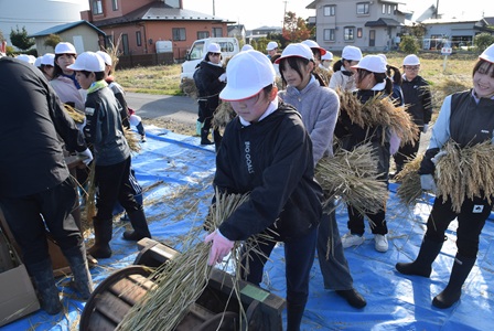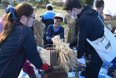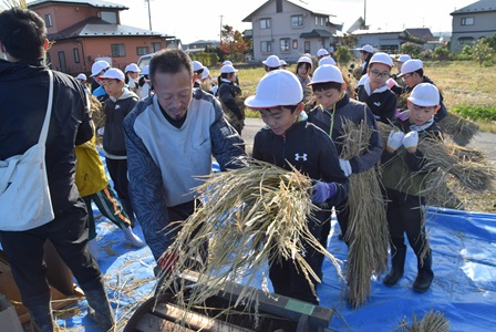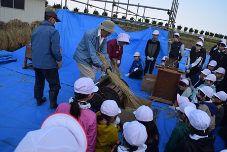 10月28日(火)お借りしている水田近く、文化幼稚園さんの駐車場で「脱穀」作業を行いました。