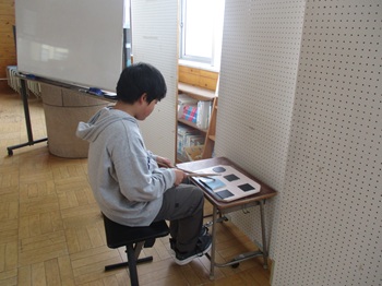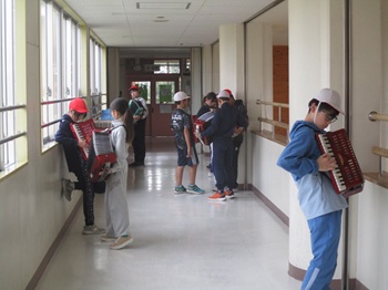 3階の通路では、同じく6年生がアコーディオンの練習をしていました。