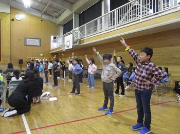 英語の歌や、昆虫太極拳を披露しました。2年生は音楽です。