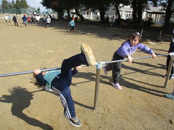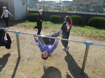「先生見てください。」逆上がりを見せてくれる子がいます。