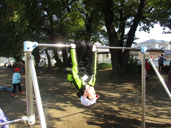 練習がんばってね。また、高い鉄棒でぶら下がっている子もいました。すごい。