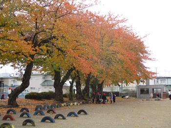 桜の木には、まだまだたくさん葉っぱがあります。また、校庭を見ると、2年生が体育の授業を行っていました。