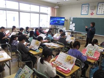 1組は、鍵盤ハーモニカの学習です。タンギングを意識してして吹いていました。