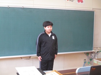 1月27日(火)今朝の全校朝会は表彰でした。最初は学校目標です。今日から5年生の計画委員会のみなさんが進行してくれます。