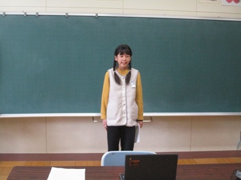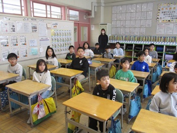 2月3日(火)今朝の全校朝会は校長先生の講話でした。その前に、5年生の代表児童が、6年生へ「6年生を送る会」の招待メッセージを発表しました。