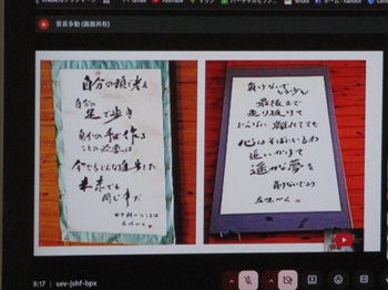 たくさん掲示されているものを校長先生が紹介してくださいました。子どもたちは姿勢よく話を聞いていました。