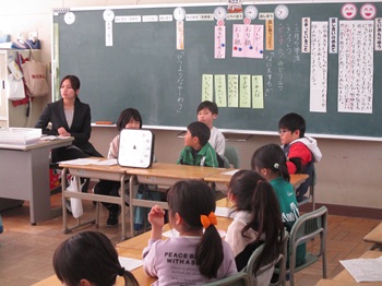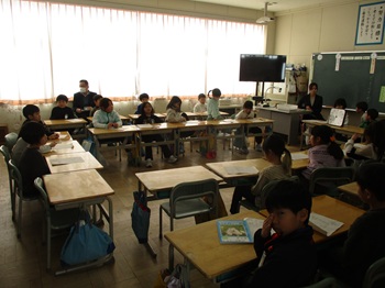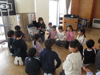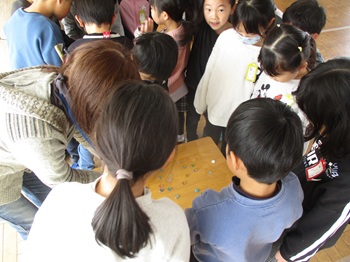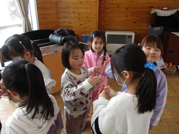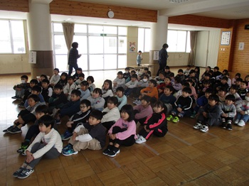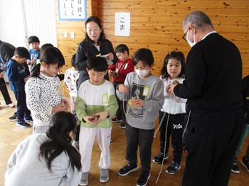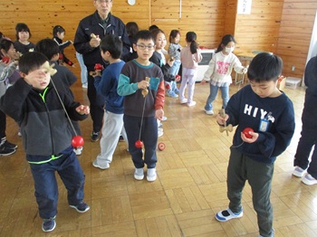 2月9日(月)今日は、特別非常勤講師の秋山先生や湊公民館の館長先生をお招きして、低学年の昔遊び教室が行われました。まずは、朝の様子から。