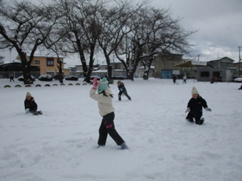 小校庭では、3年生が雪合戦をしていました。
