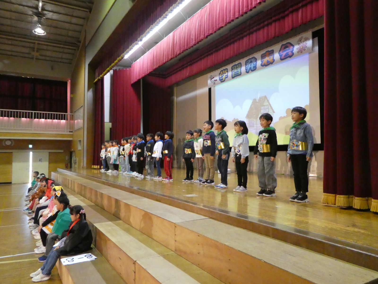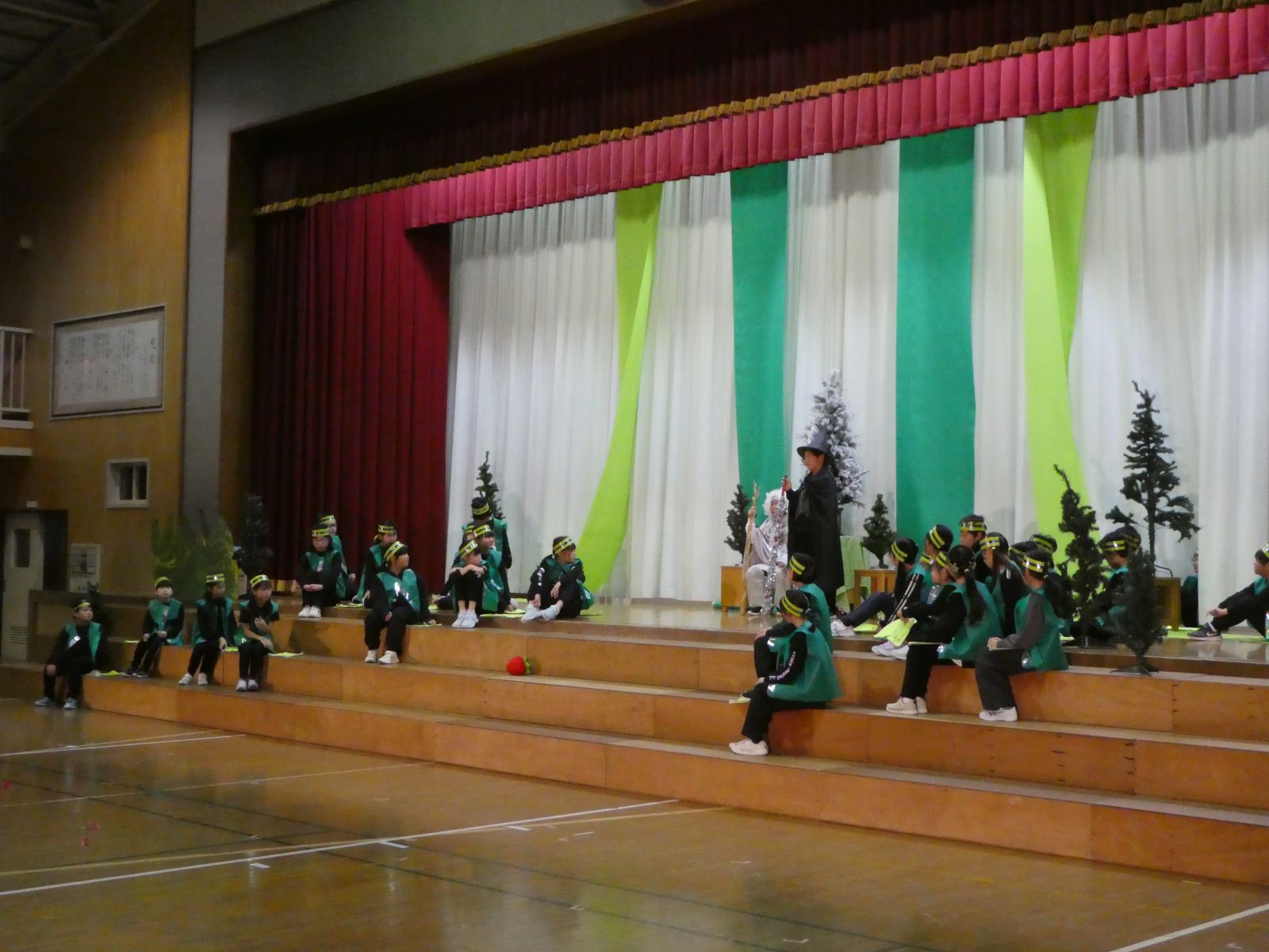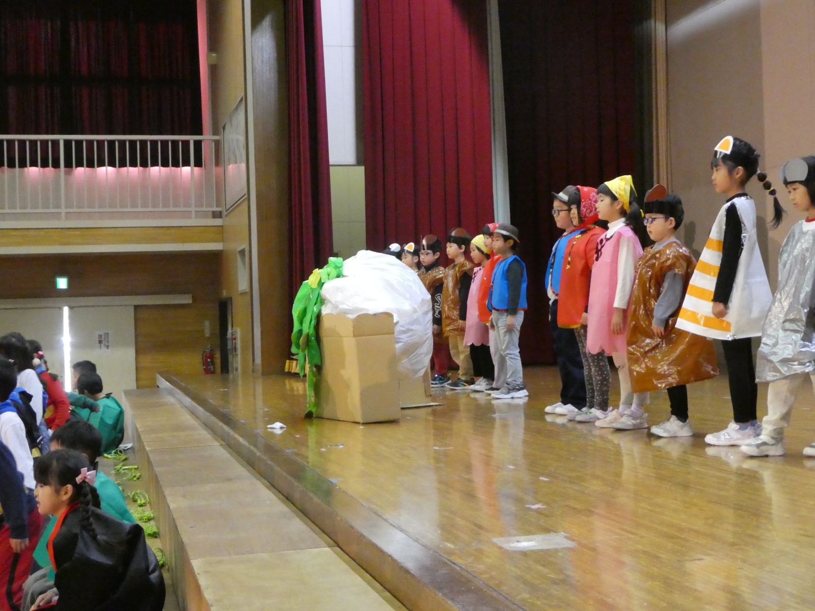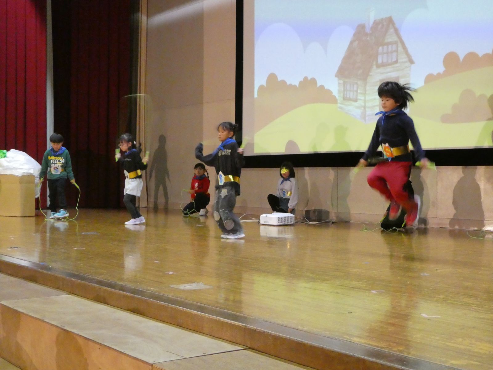 最初は1年生のはじめの言葉と、劇『大きなかぶ』でした。入学してやっと半分が過ぎたぐらいですが、大きな声でセリフを話したり、縄跳びなどを披露したりと、元気いっぱいに発表することができました。