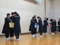 2月9日(火)の全校朝会で、3年生の高校受験の健闘と合格を祈念して、1,2年生からお守りと千羽鶴が贈呈されました。2月12日(金)には私立高校、2月14日(日)国立高専、3月8日(火)公立高校の受験があります。後輩の応援を受けて精一杯がんばってほしいと思います。