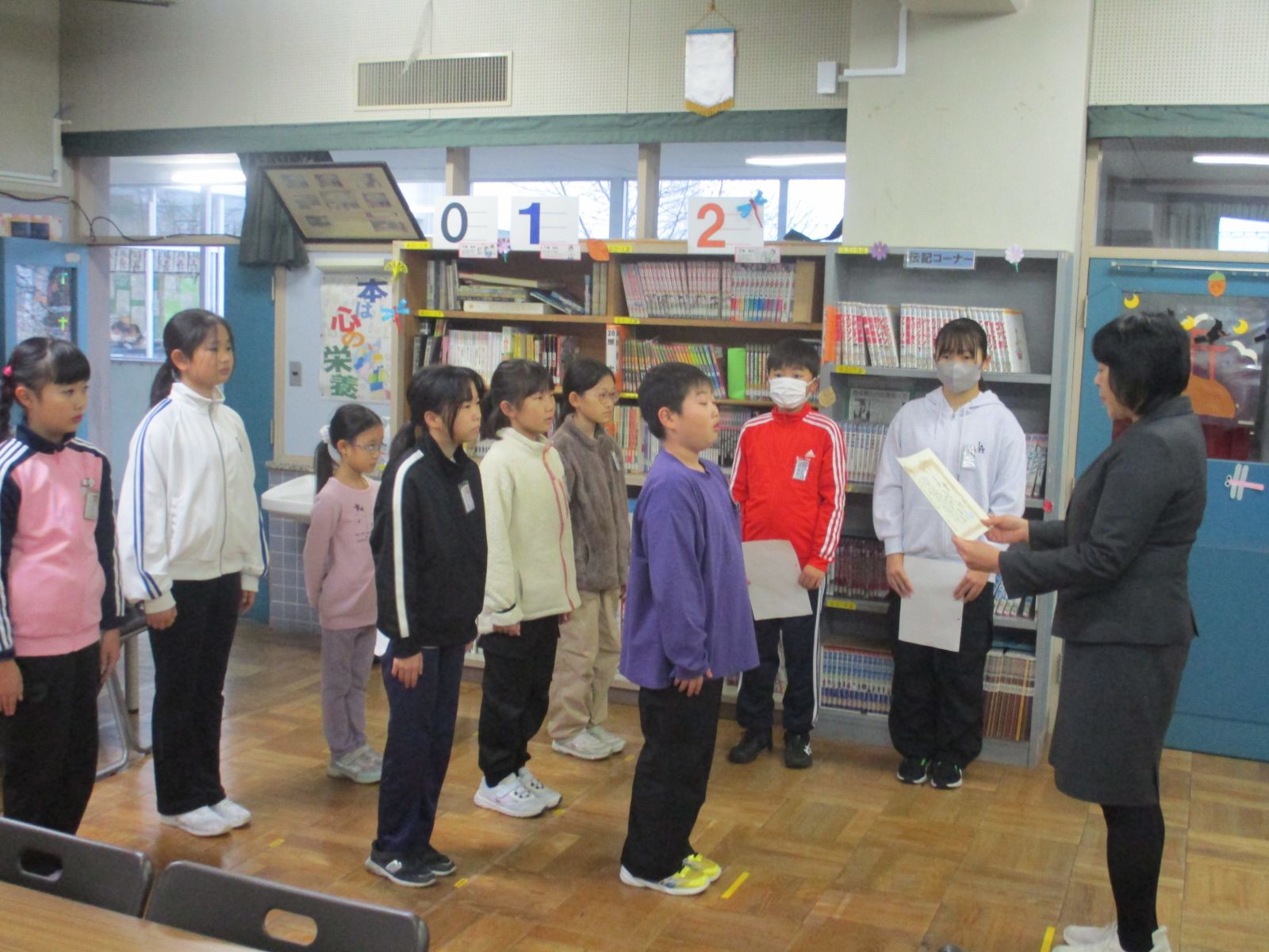 11月26日(水)、全校朝会で賞状伝達をしました。今日はR7「八戸市歯科医師会」歯科保健図画ポスターコンクール金賞、R7「青森県歯科医師会」歯科保健図画ポスターコンクール金賞、赤い羽根共同募金ポスターコンクール佳作、努力賞、社会科自由研究優秀賞、交通安全ポスターコンクール同省、明るい選挙啓発ポスターコンクール入選、のべ9人を表彰しました。