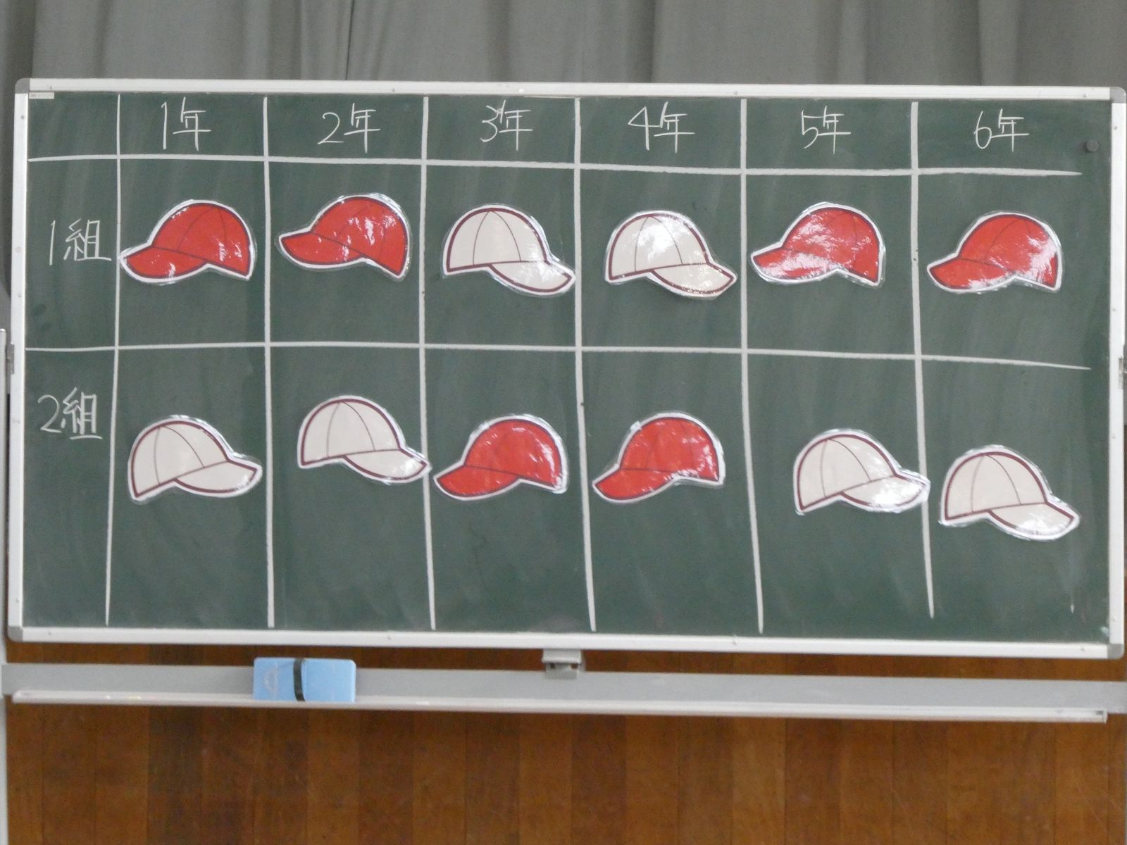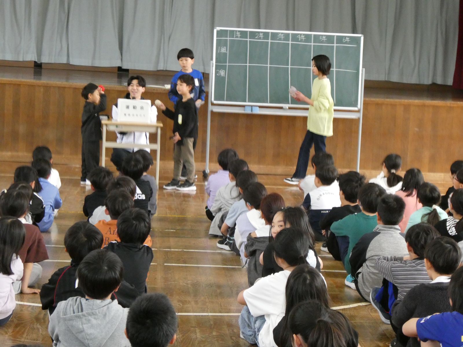4月22日(水)、全校朝会で、運動会の組分け抽選会を行いました。運動会は5月16日(土)です。