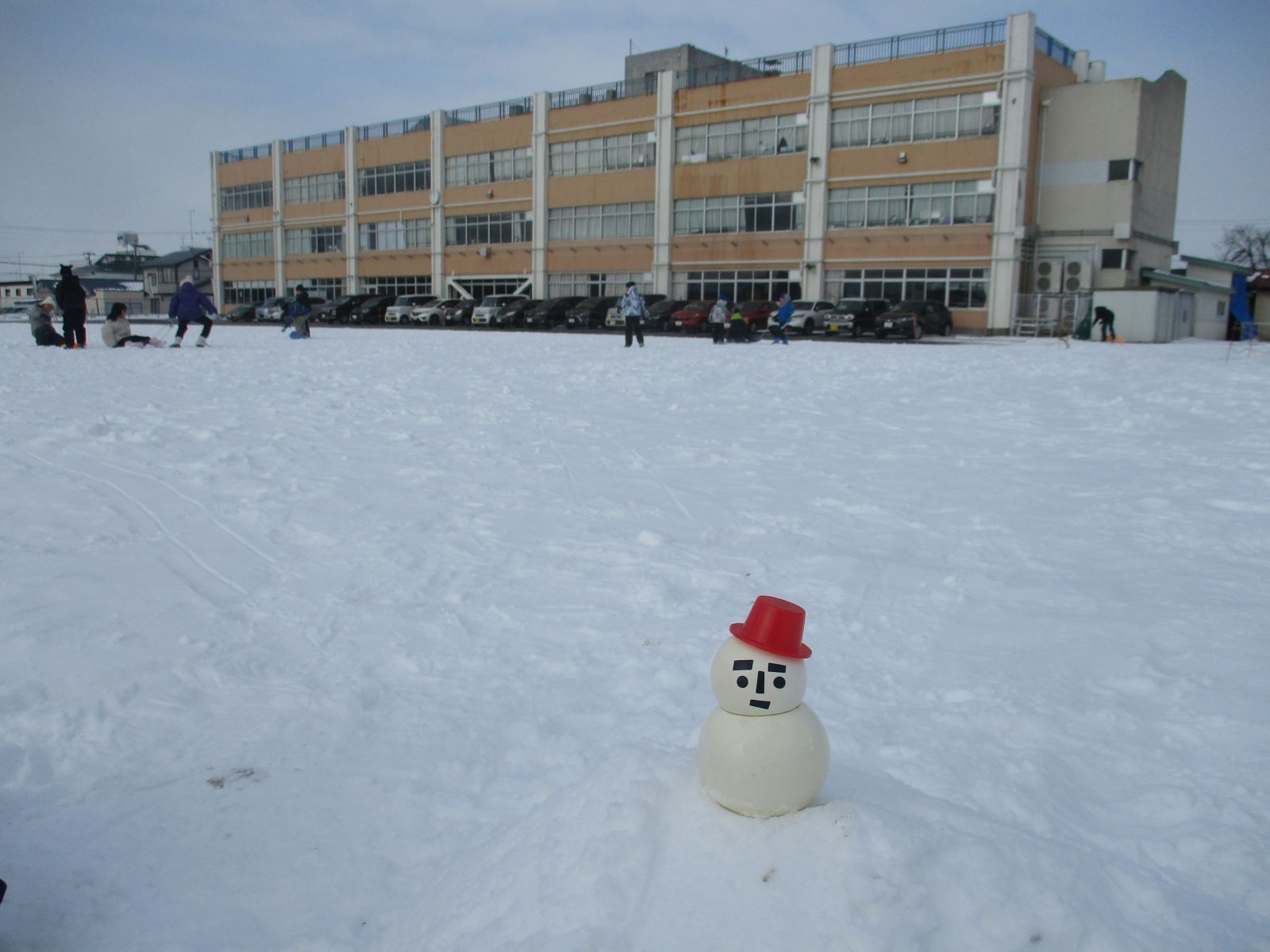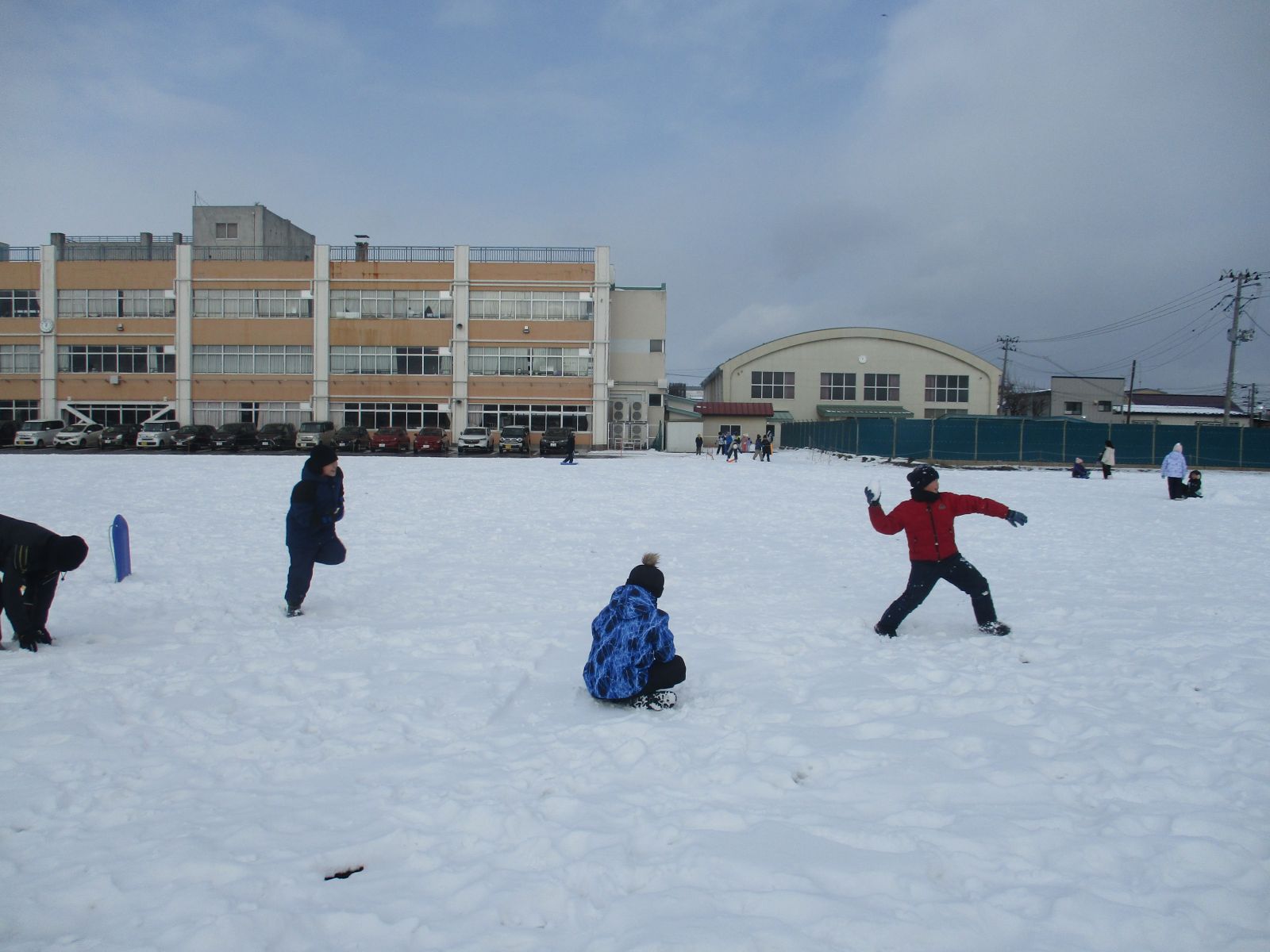 1月26日(月)の昼休みの校庭の様子です。青空の下、雪合戦やそり遊びをしています。
