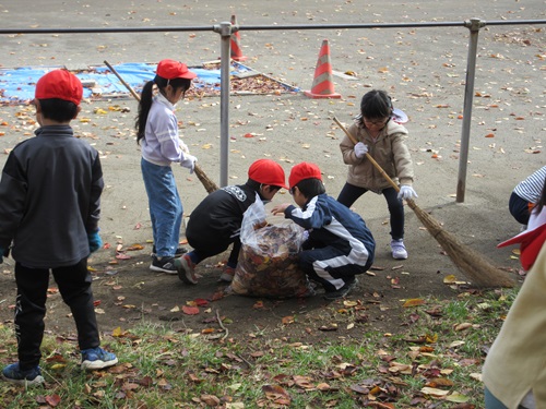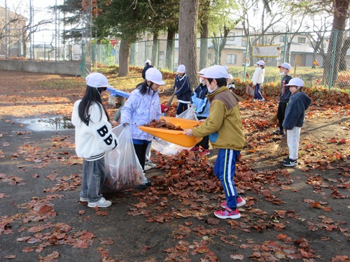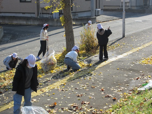 クリーン作戦で落ち葉掃きをしました。この時期は、集めても集めても葉っぱが落ちてきてしまいますが、少しでもきれいにしようと時間いっぱい落ち葉掃きをがんばりました。