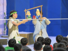 演劇鑑賞教室を実施しました。今年は、劇団「風の子」のプログラムを鑑賞しました。プログラムの前半は、からだ、顔、手をつなげて、触れ合って生まれる遊びや紙飛行機などを飛ばす遊び、後半は、「奥山ばなし」というお話を披露してくれました。子供たちは、演者が繰り広げる不思議な世界、楽しい世界、悲しい世界の中に浸り、充実した時間を過ごすことができました。
