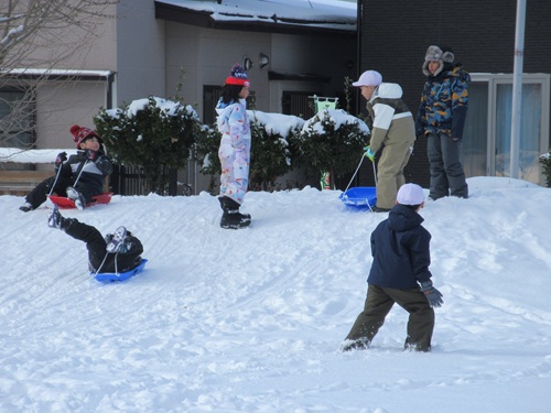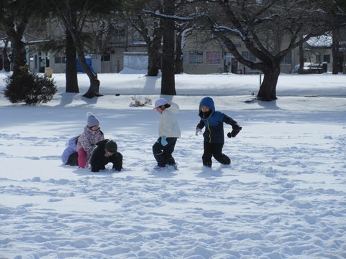 休み時間の様子の写真です。寒さに負けず、雪遊びを楽しんでいます。