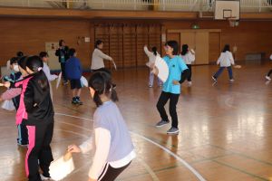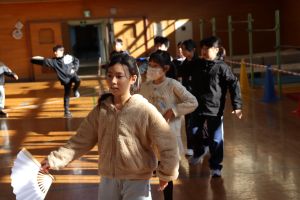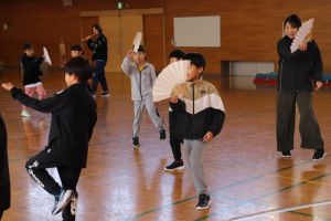 駒踊保存会の方々に来ていただき教えてもらいました。踊るのは初めてですが、先輩たちの踊りを何度も見ているので上達も早いようです。